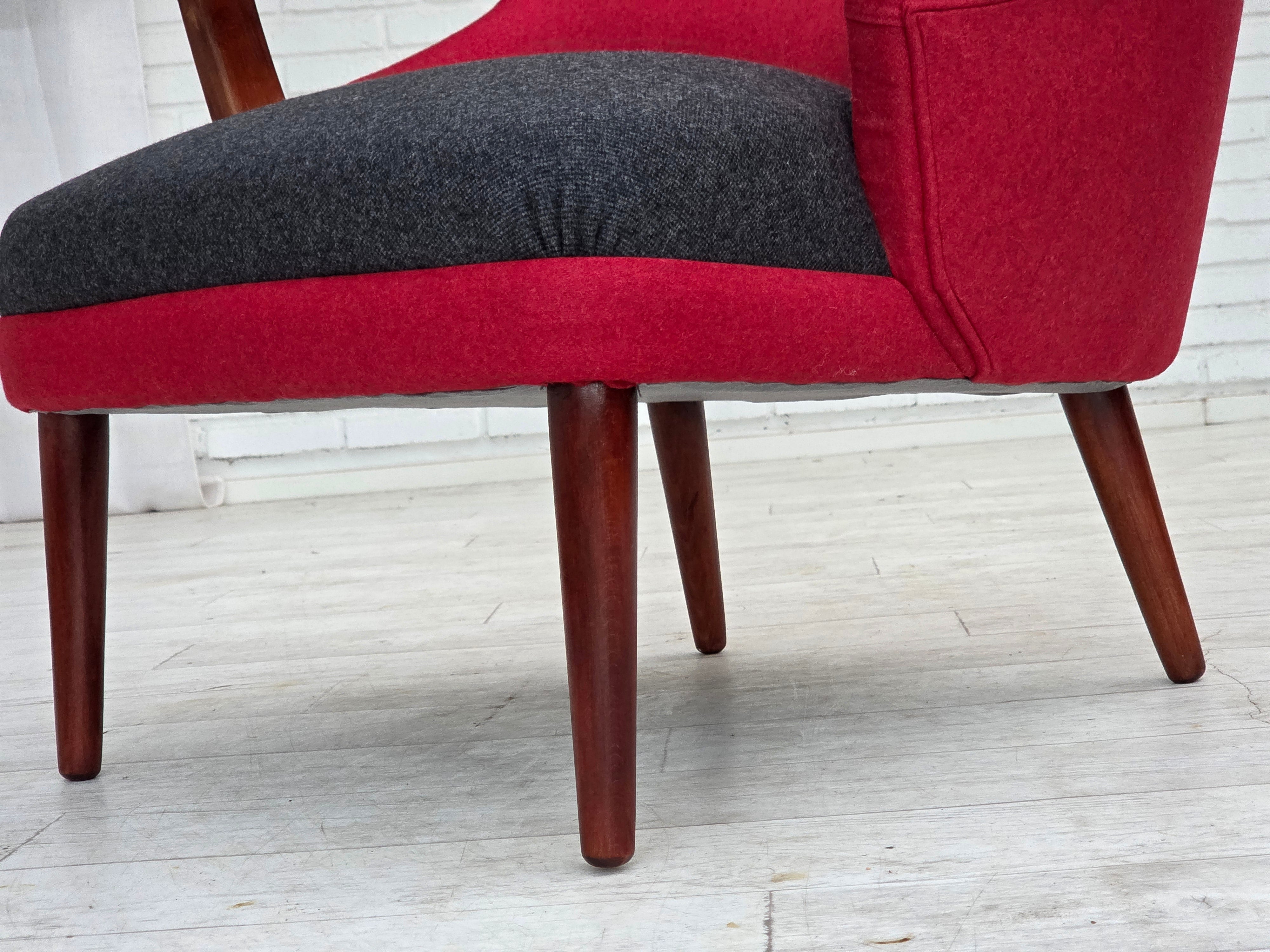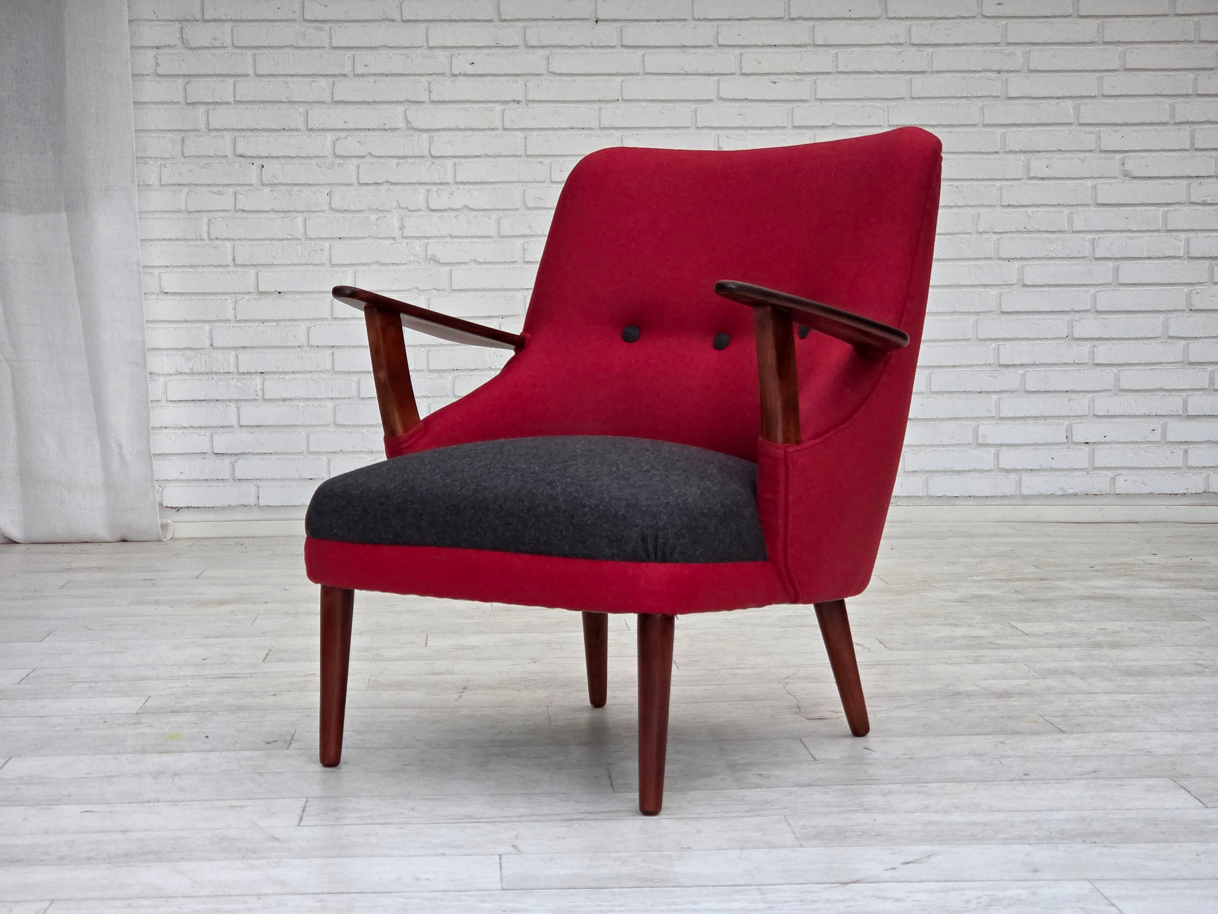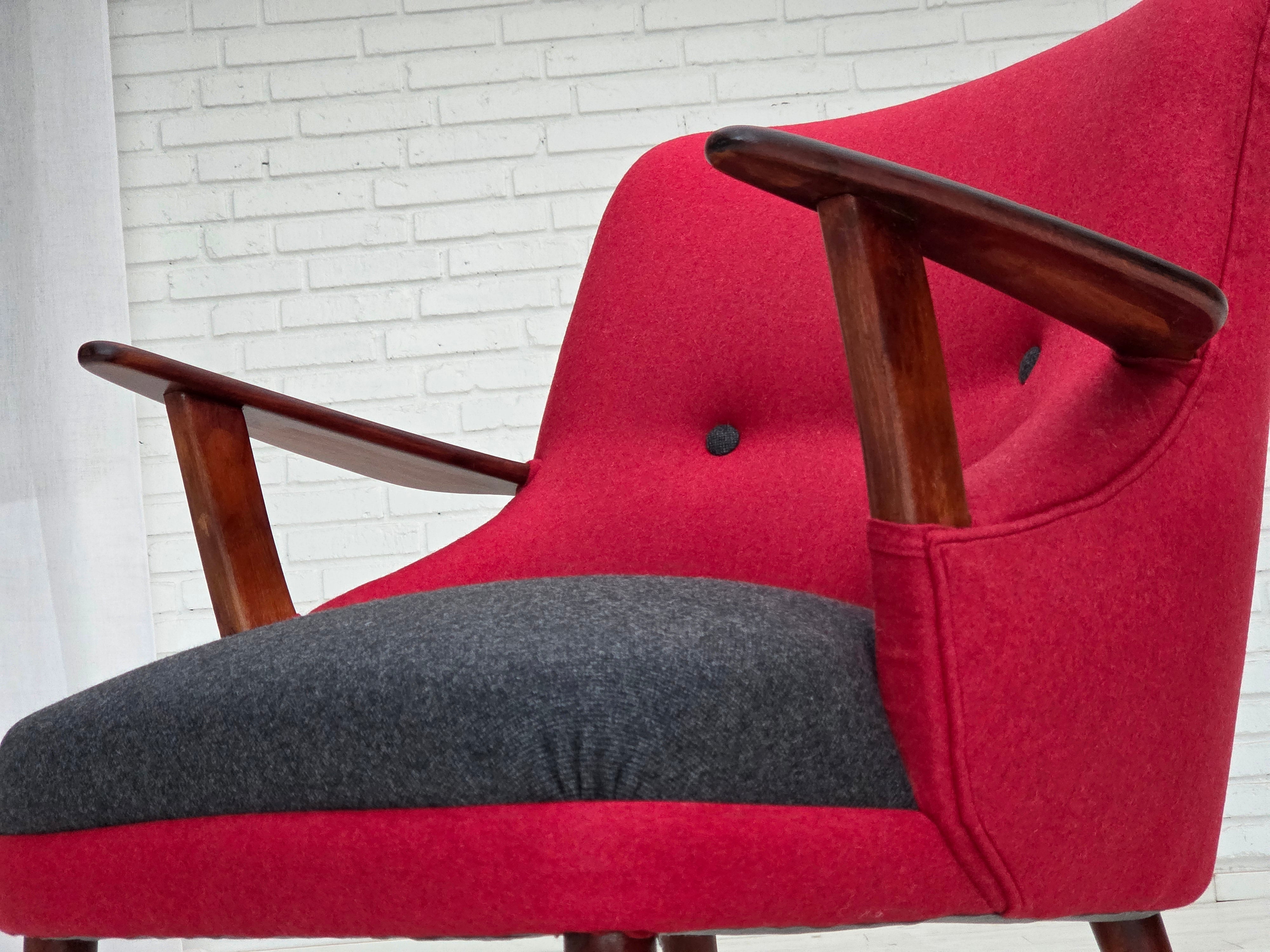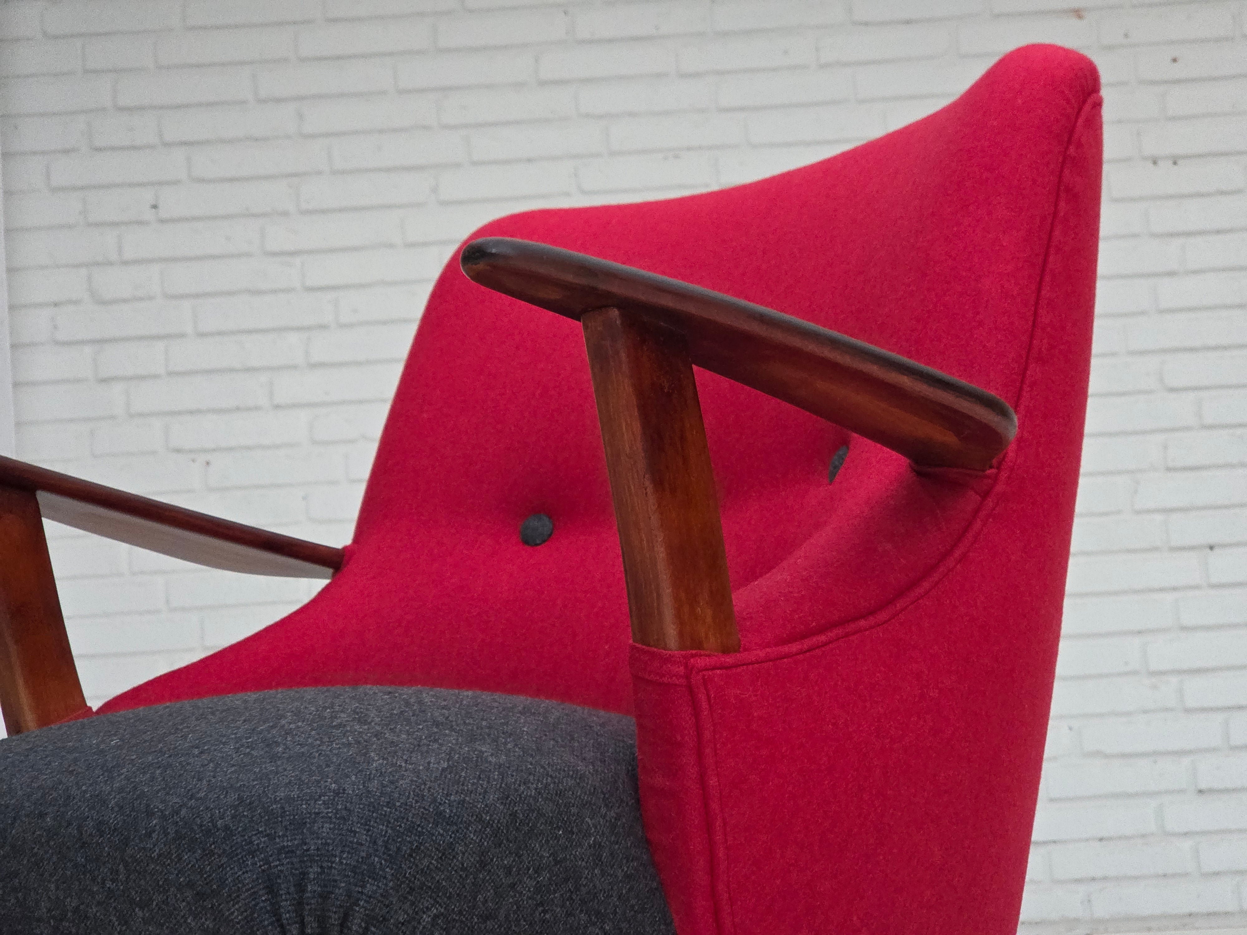 1960erne, Dansk designet lænestol. Total renoveret i kvalitets møbeluld i rød og grå farve. Forfrisket mørke bøgetræ og fjedre i sædet beholdes. Fremstillet af Dansk møbelproducent i ca. 1960-65erne. Reupholsteret hos Retro Møbler Galleri af professionel møbelpolstrer, håndværker.