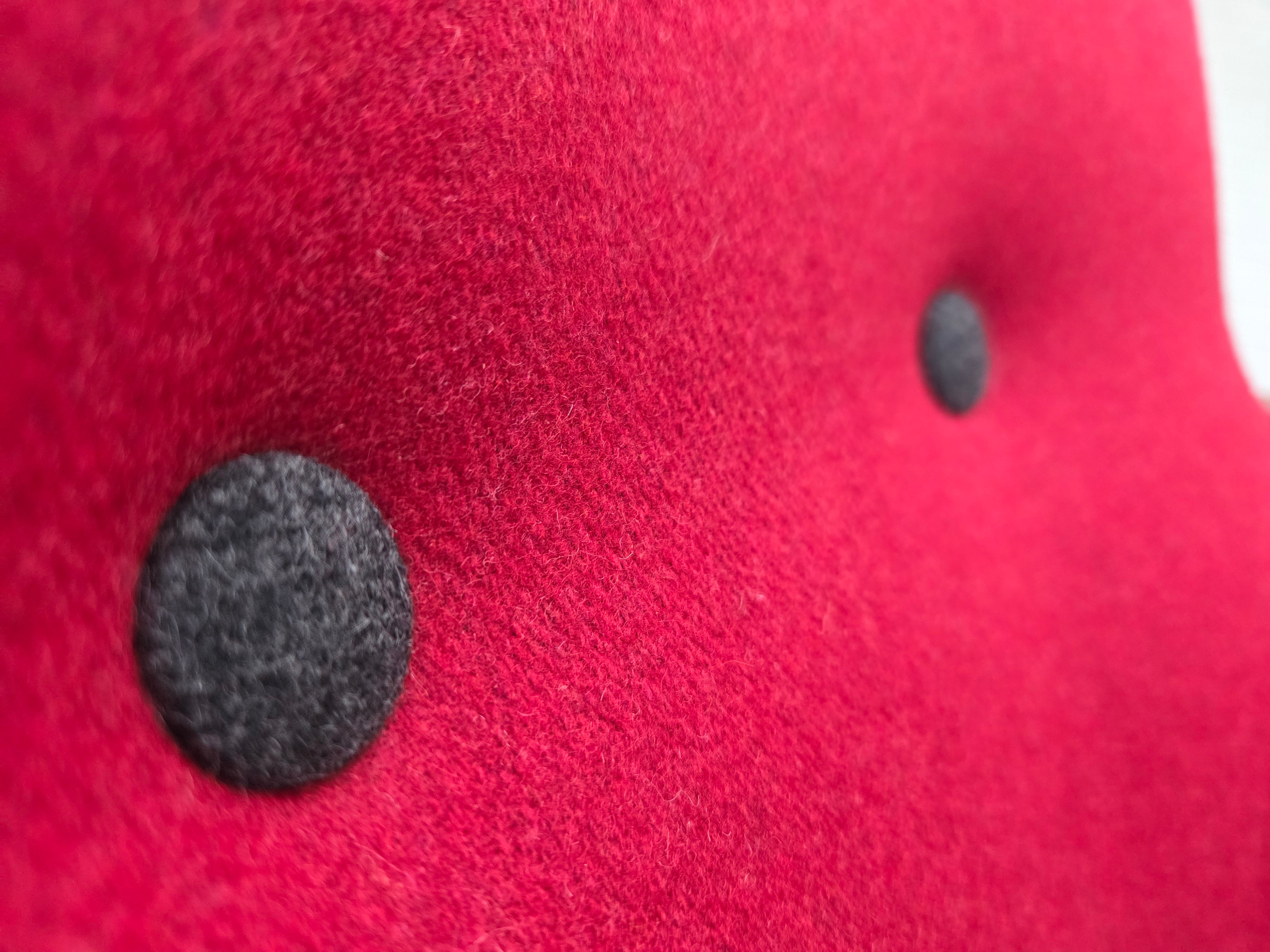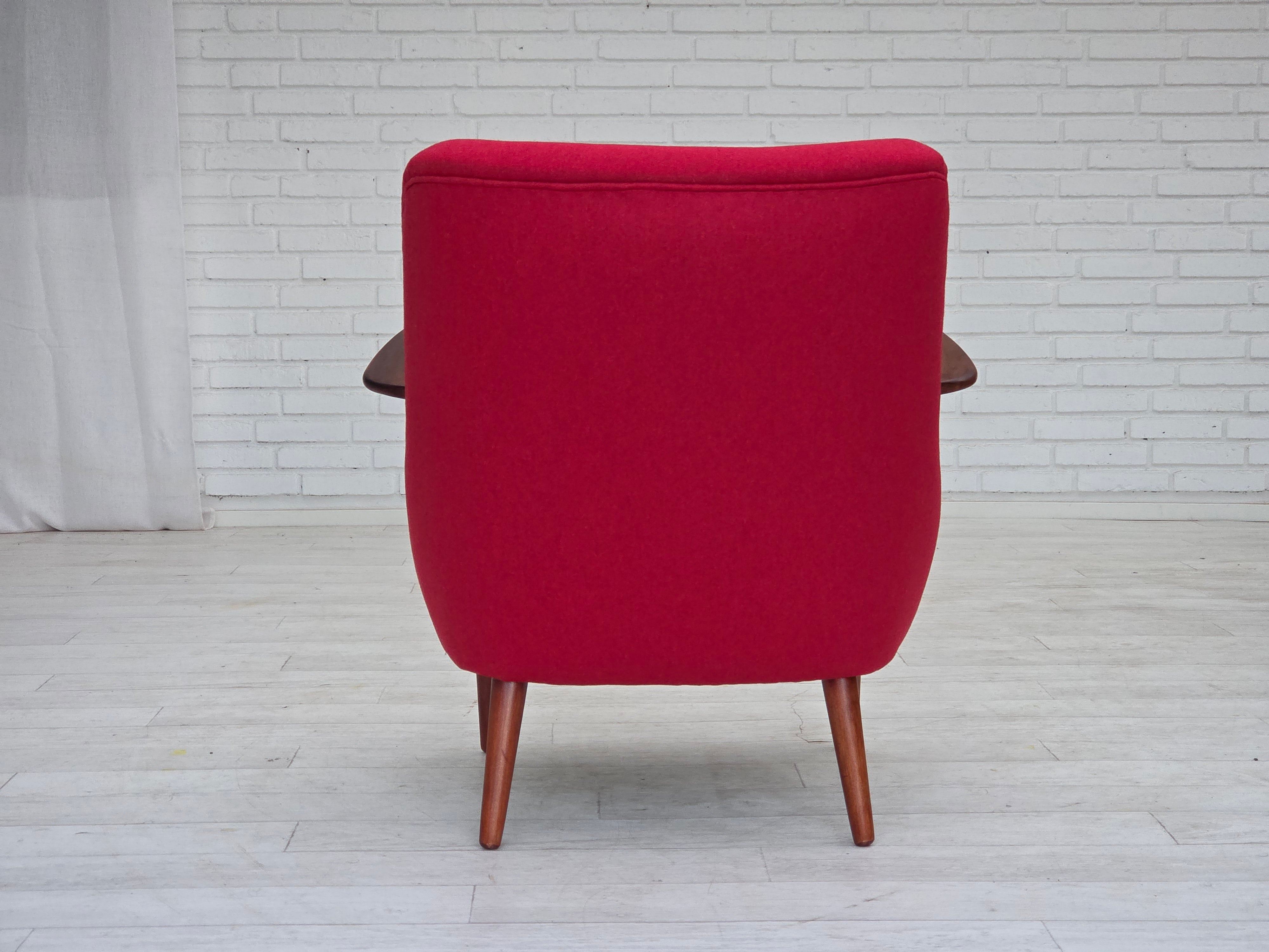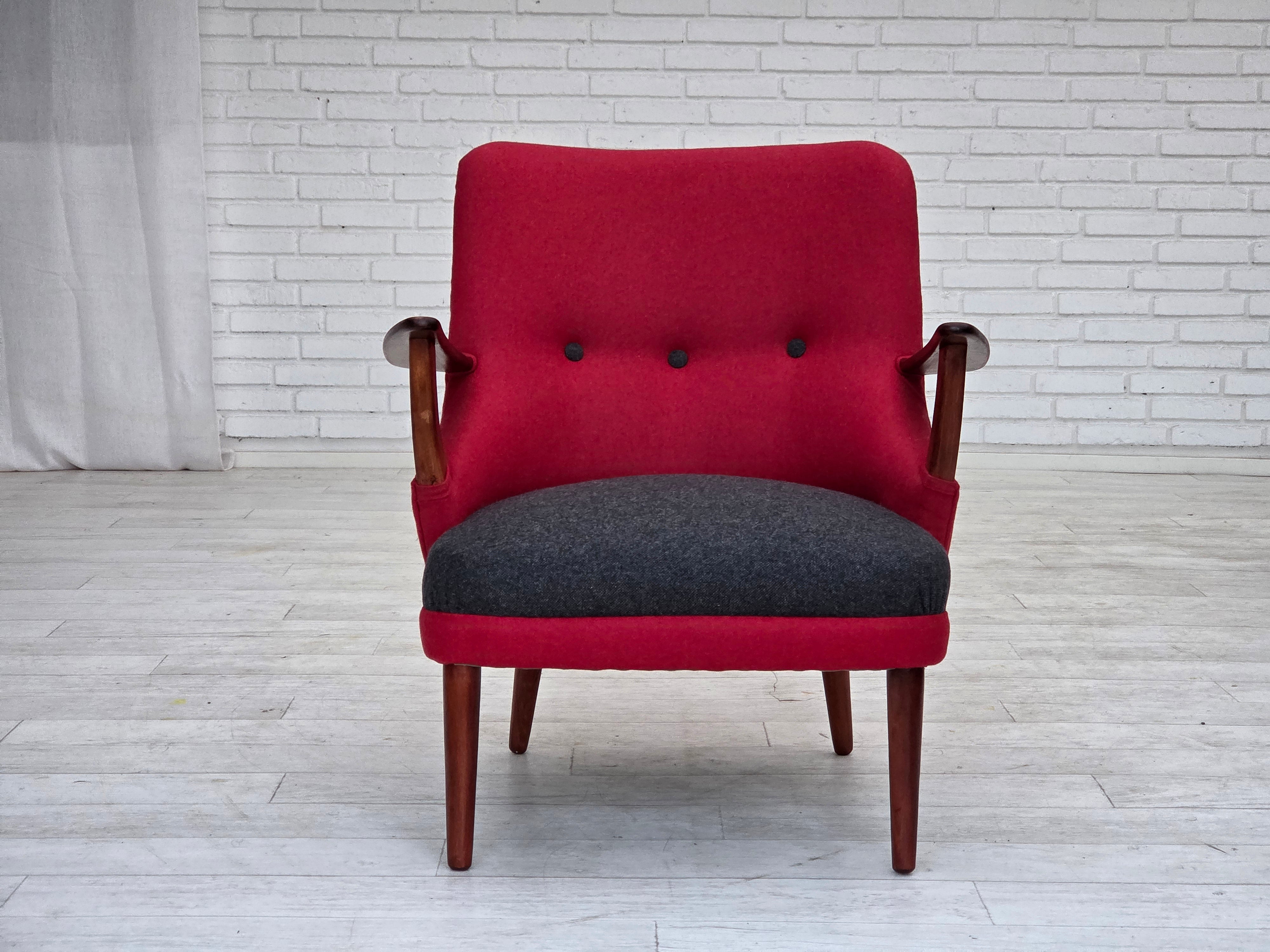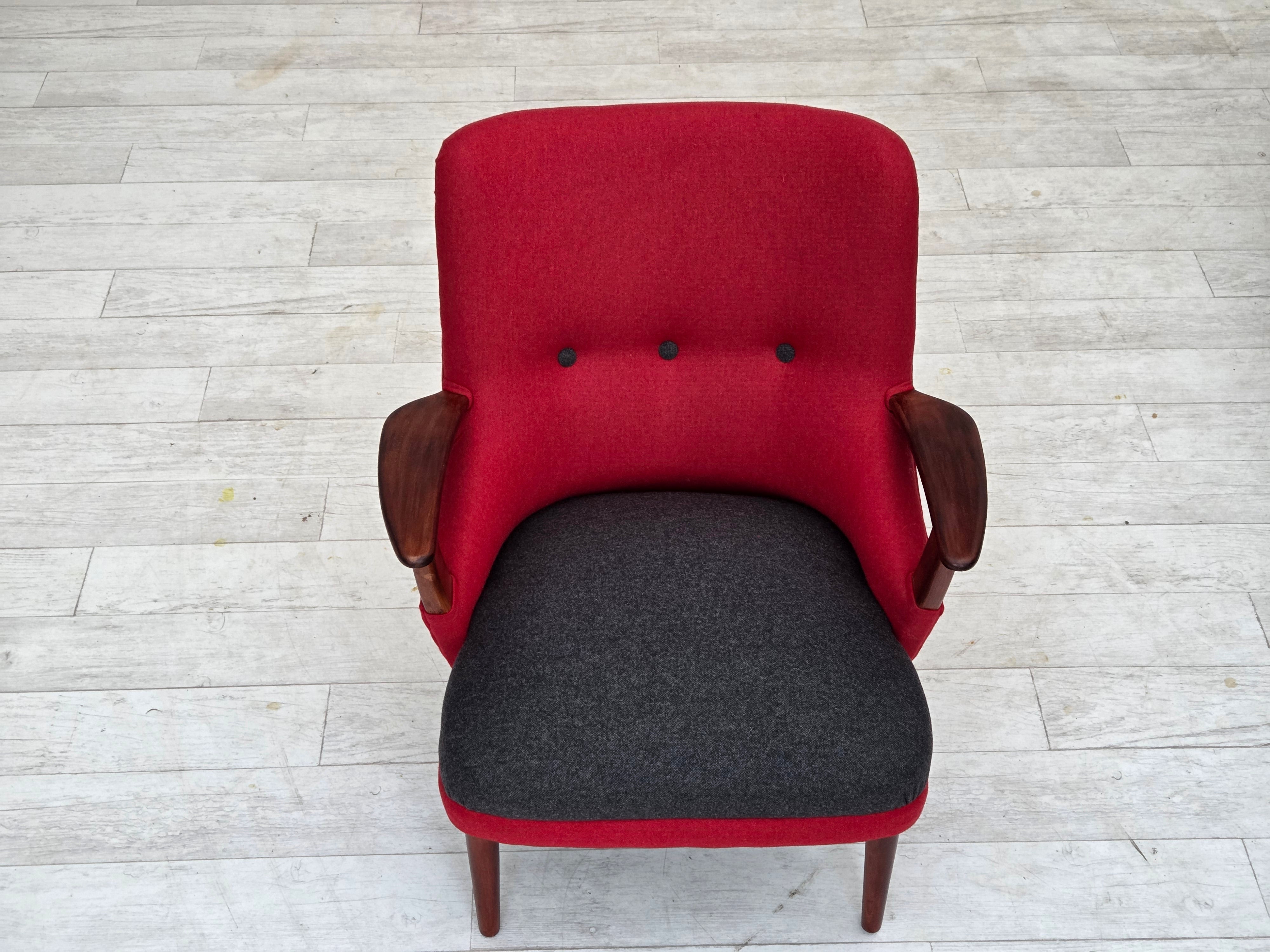 1960erne, Dansk designet lænestol. Total renoveret i kvalitets møbeluld i rød og grå farve. Forfrisket mørke bøgetræ og fjedre i sædet beholdes. Fremstillet af Dansk møbelproducent i ca. 1960-65erne. Reupholsteret hos Retro Møbler Galleri af professionel møbelpolstrer, håndværker.
