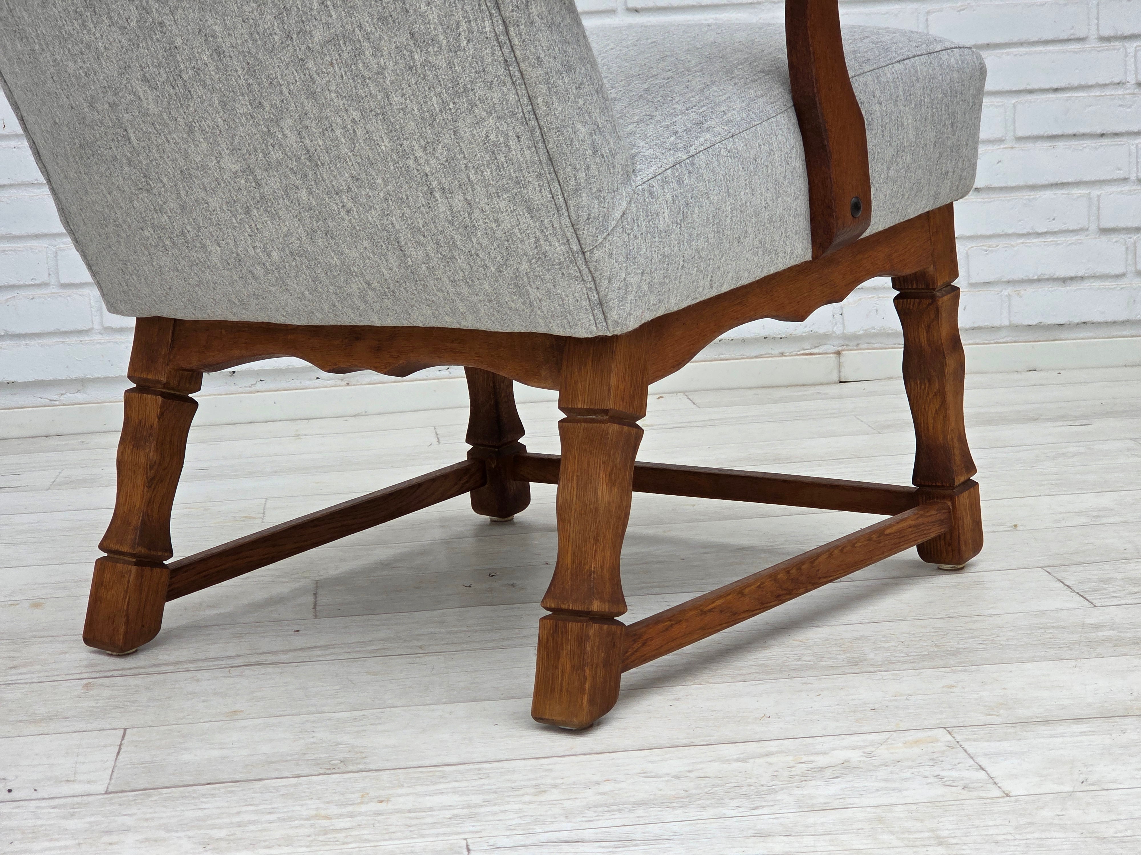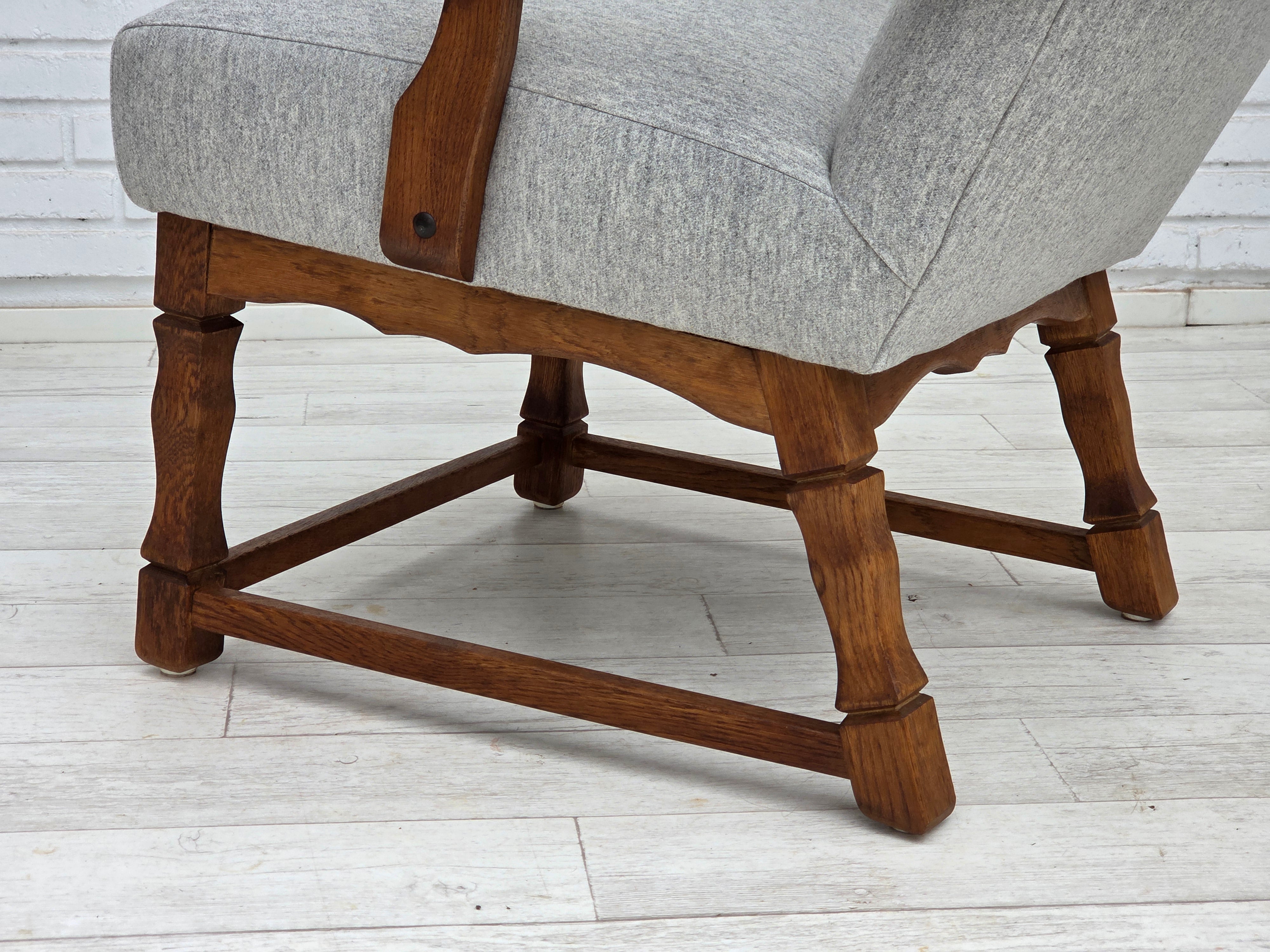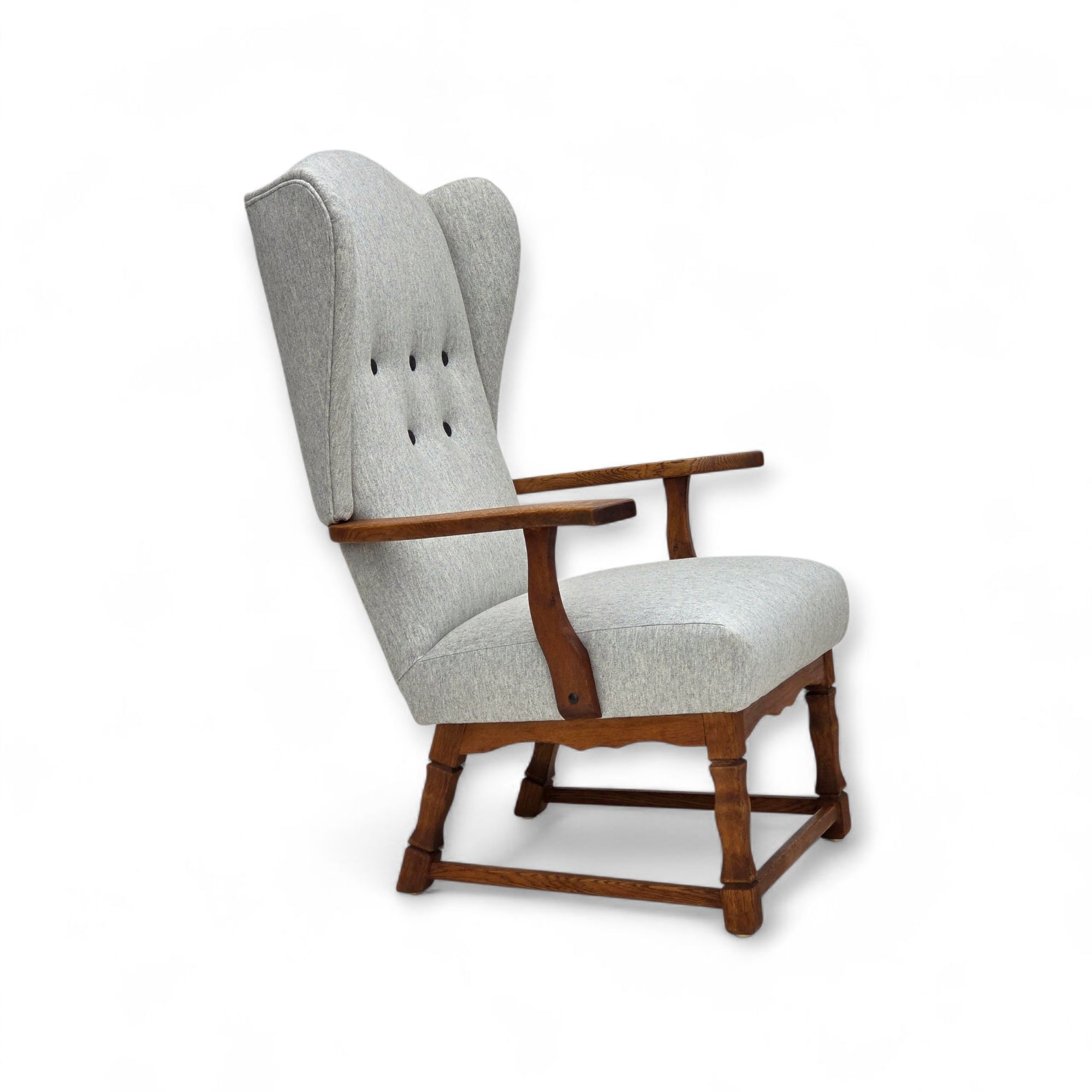 1950erne, Dansk højrygget lænestol. Total renoveret i kvalitets lysegrå møbeluld. Massiv egtræ fornyet. Helt ny polstring. Fremstillet af Dansk møbelproducent i ca. 1950-55erne. Reupholsteret hos Retro Møbler Galleri af professionel møbelpolstrer, håndværker.