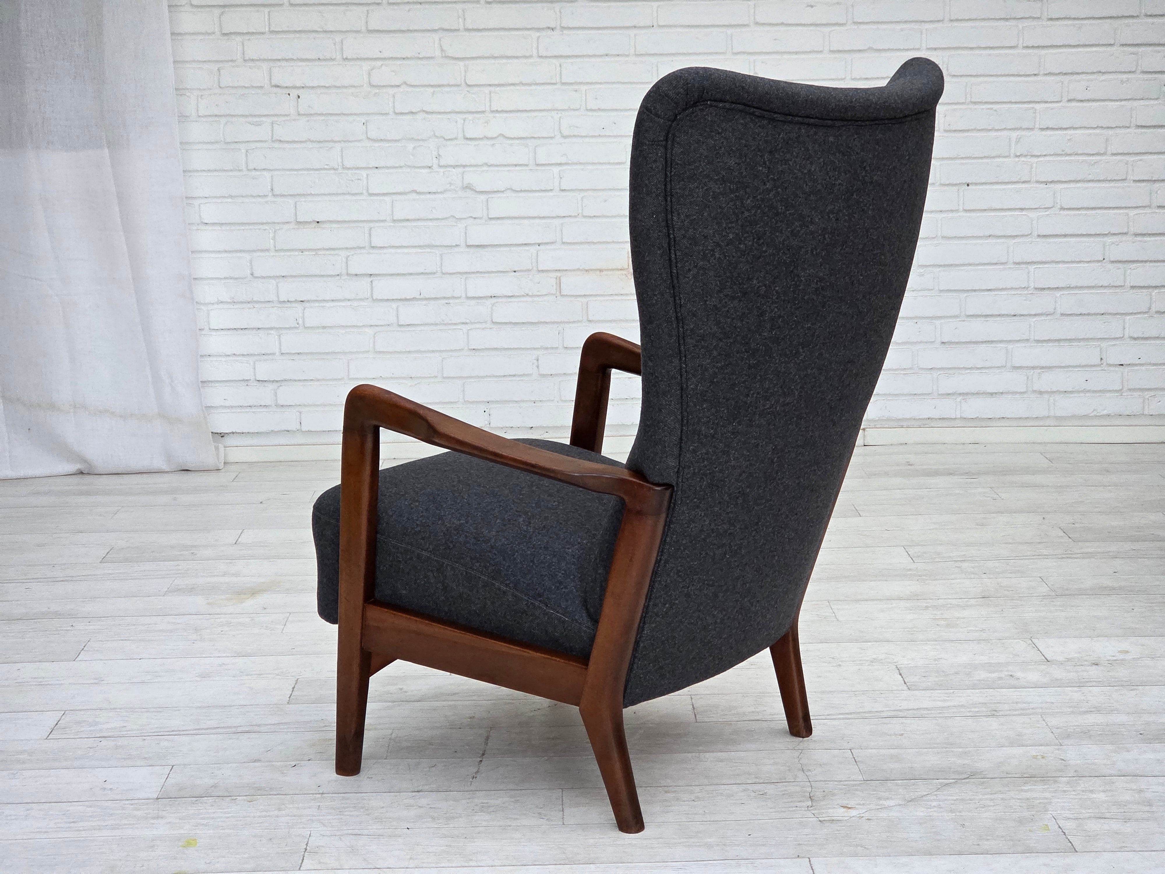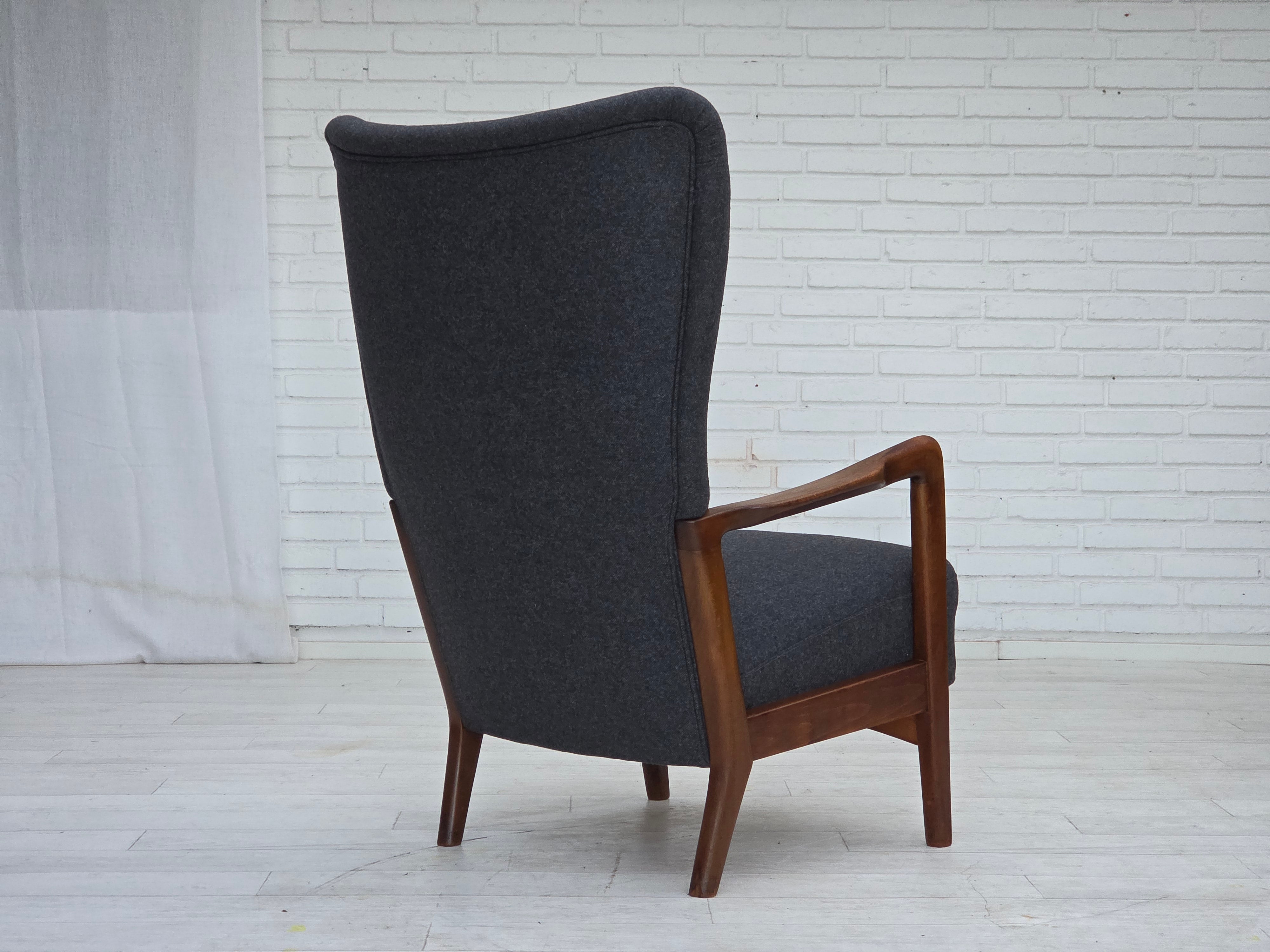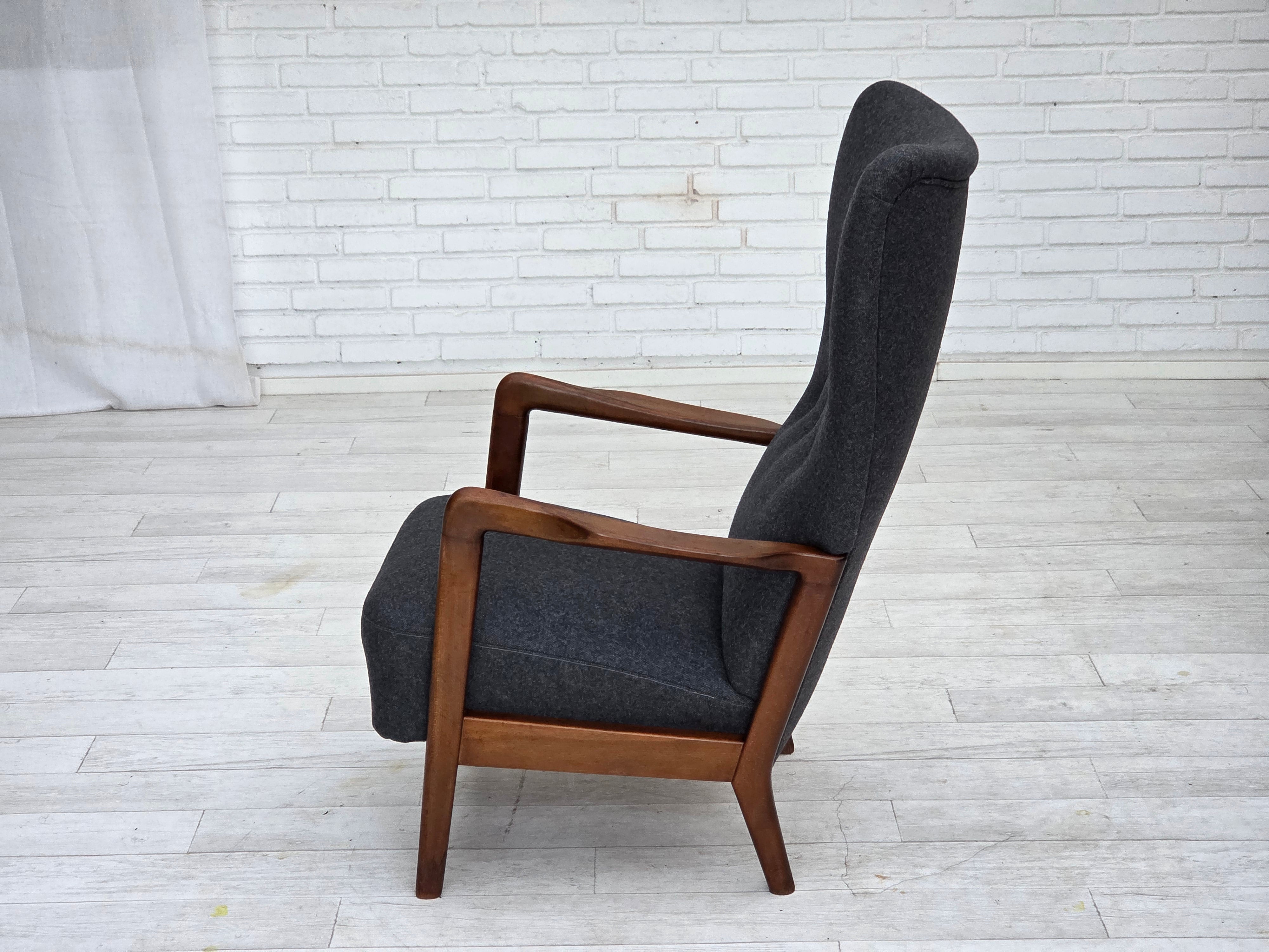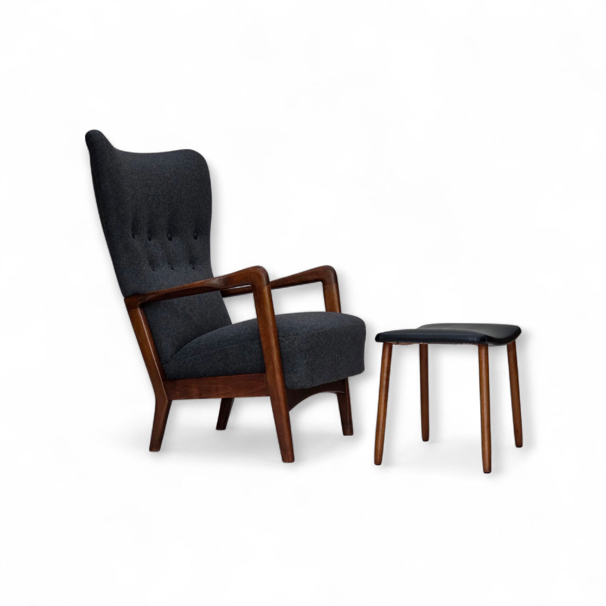 1960erne, Dansk højrygget lænestol af Fritz Hansen model 8000/8020. Reupholsteret i kvalitets mørkegrå møbeluld. Bøgetræ fornyet, fjedre i sædet og rygget beholdes. Knapper og skammel i sort kunst læder. Delvis ny polstring. Fremstillet af Dansk møbelproducent Fritz Hansen i ca. 1965-70erne. Renoveret hos Retro Møbler Galleri af professionel møbelpolstrer, håndværker.