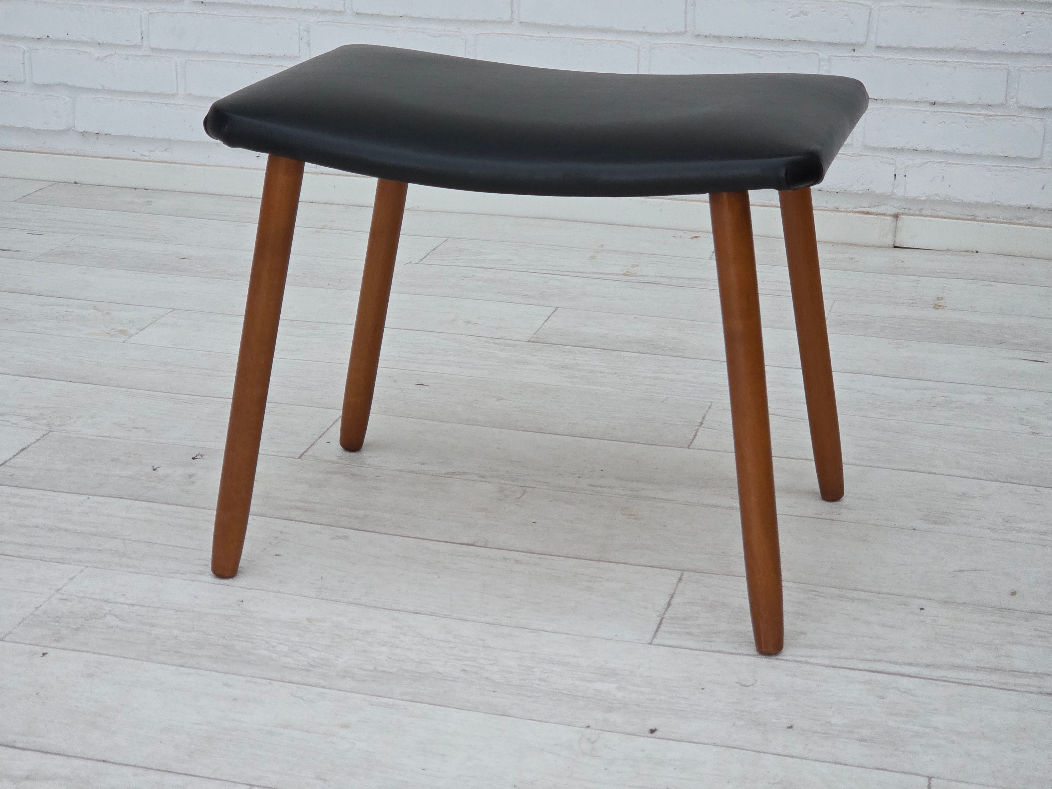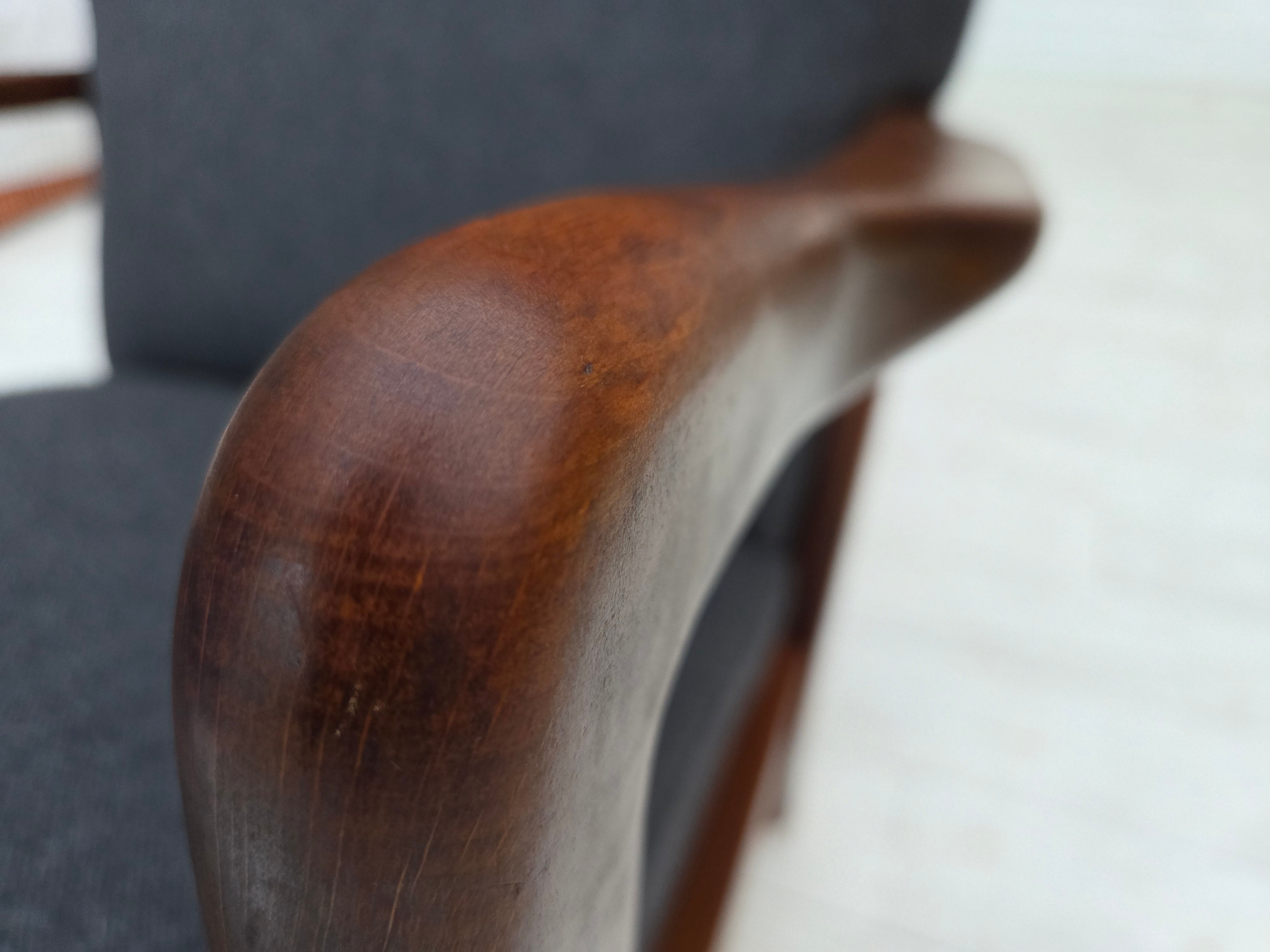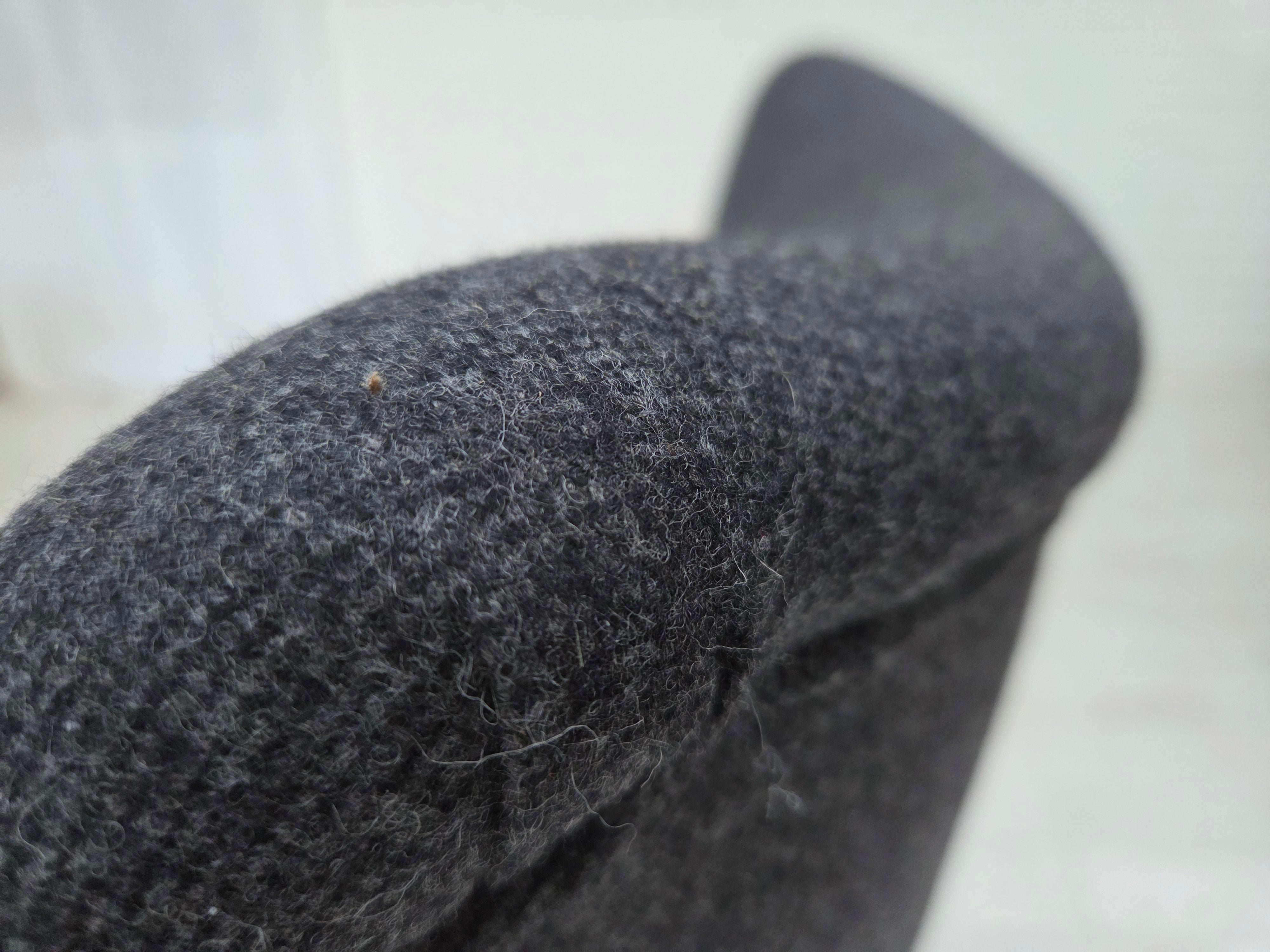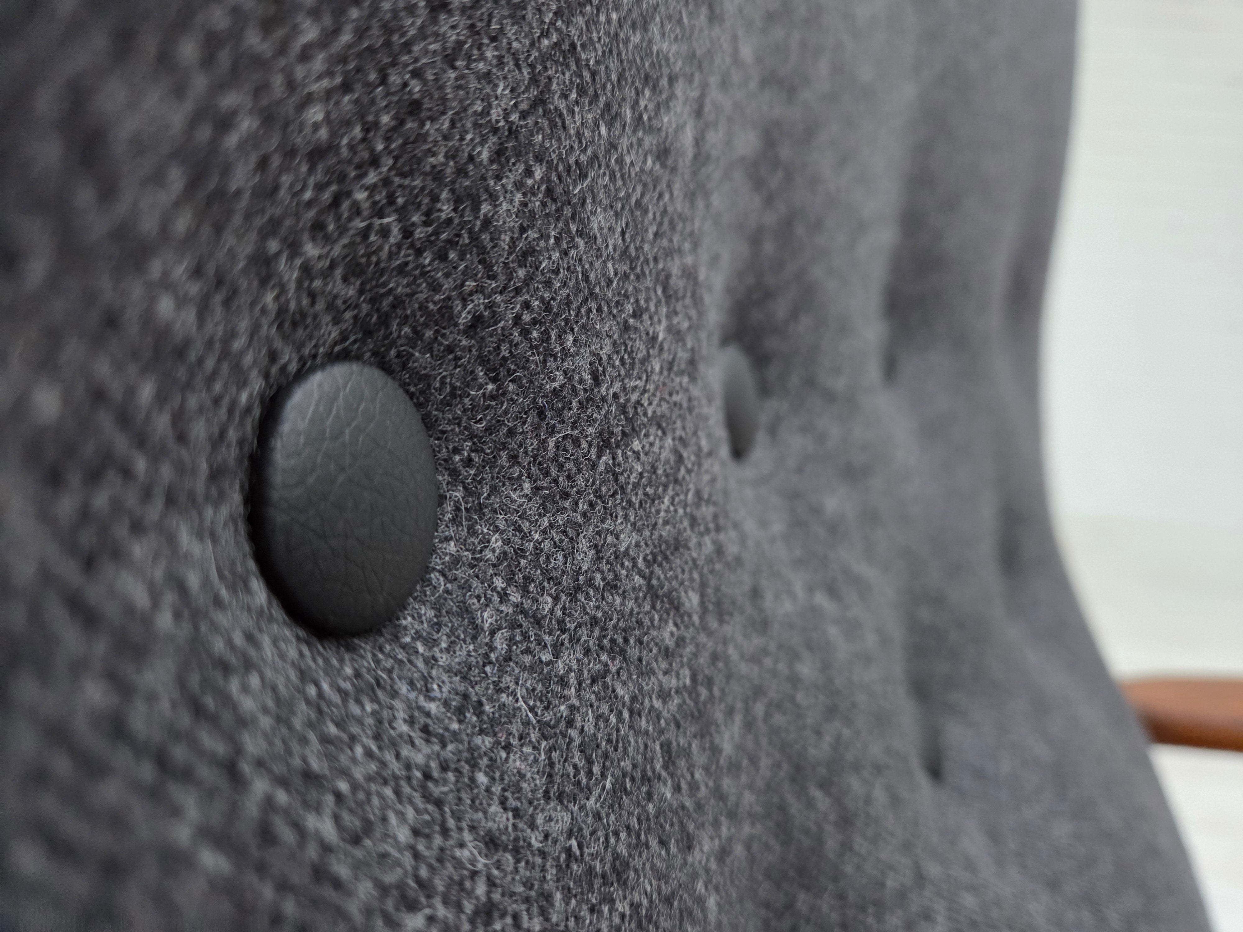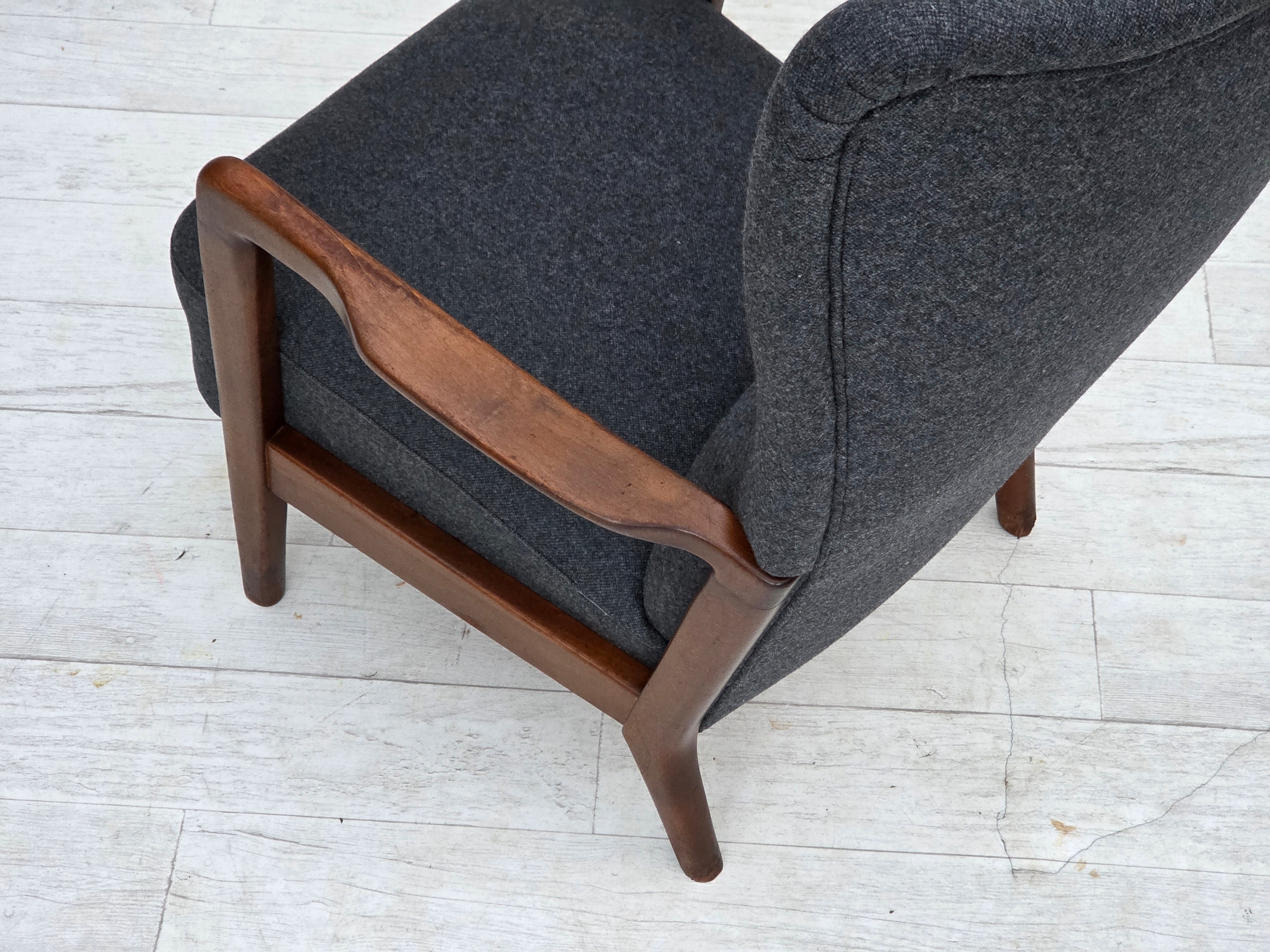 1960erne, Dansk højrygget lænestol af Fritz Hansen model 8000/8020. Reupholsteret i kvalitets mørkegrå møbeluld. Bøgetræ fornyet, fjedre i sædet og rygget beholdes. Knapper og skammel i sort kunst læder. Delvis ny polstring. Fremstillet af Dansk møbelproducent Fritz Hansen i ca. 1965-70erne. Renoveret hos Retro Møbler Galleri af professionel møbelpolstrer, håndværker.