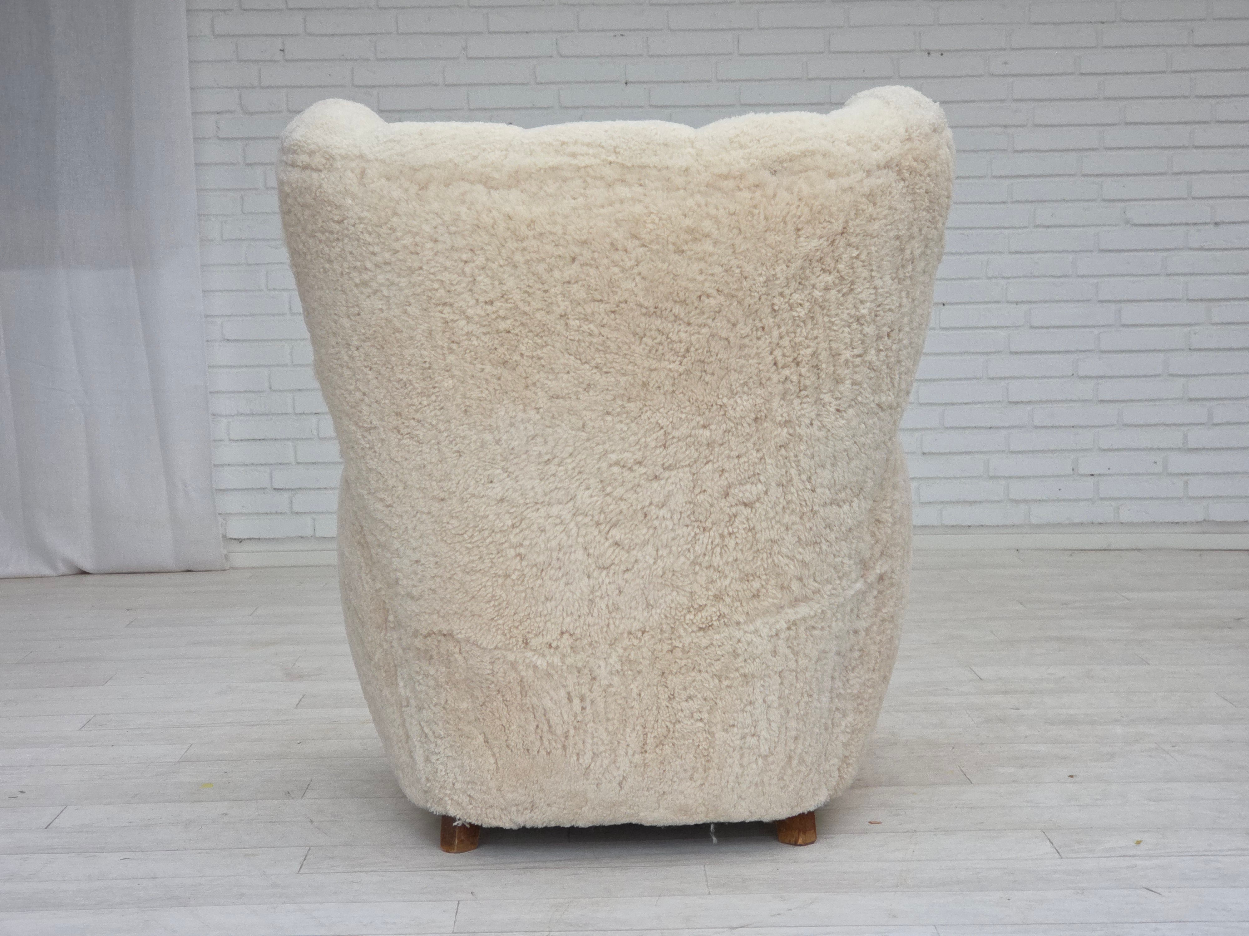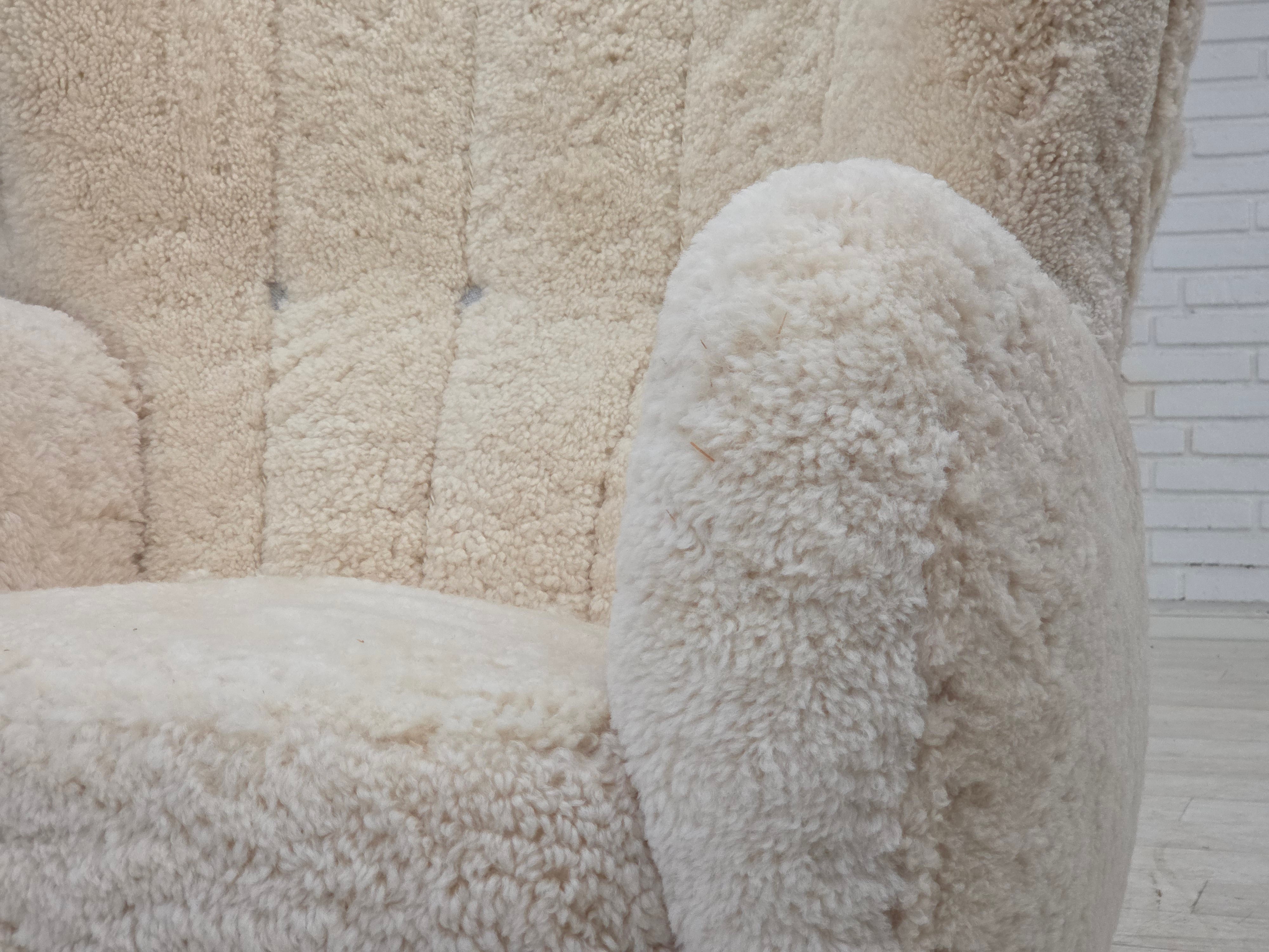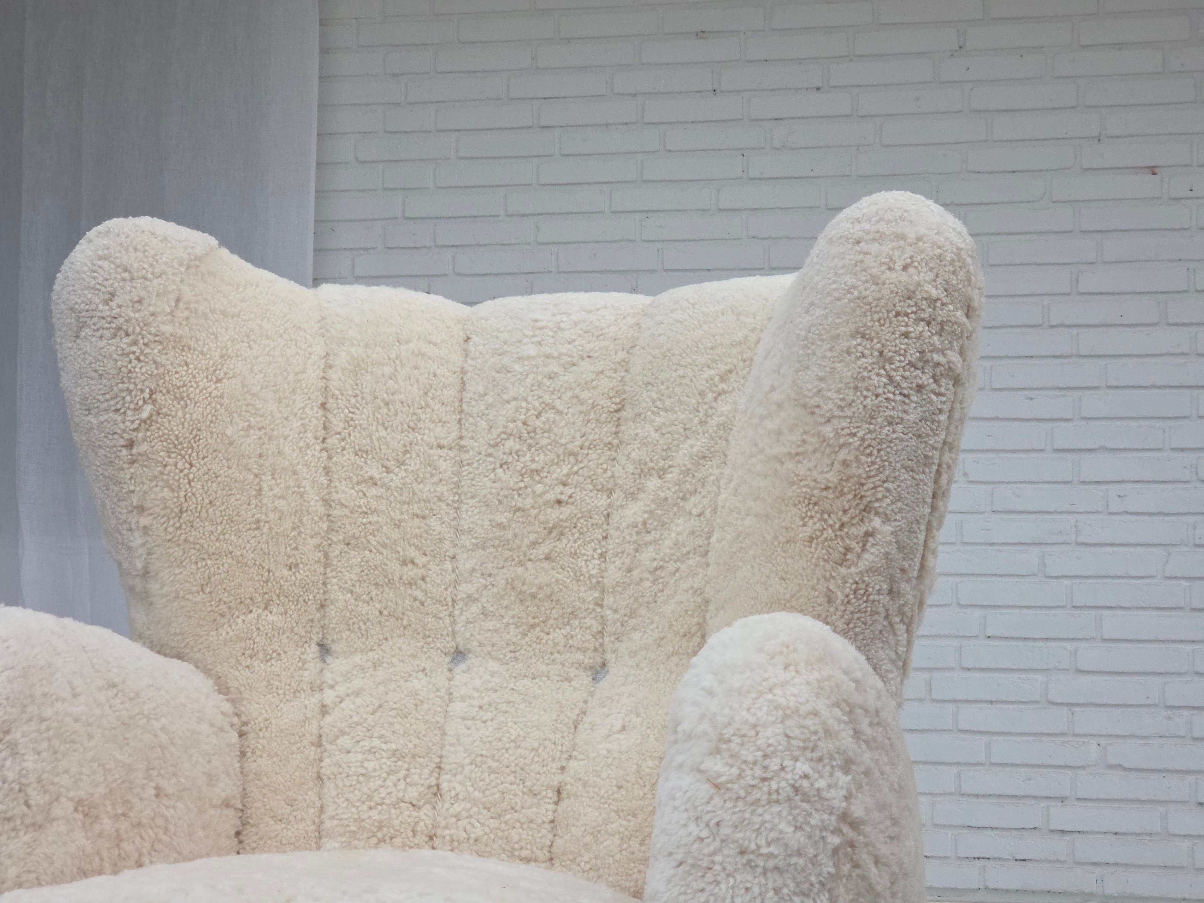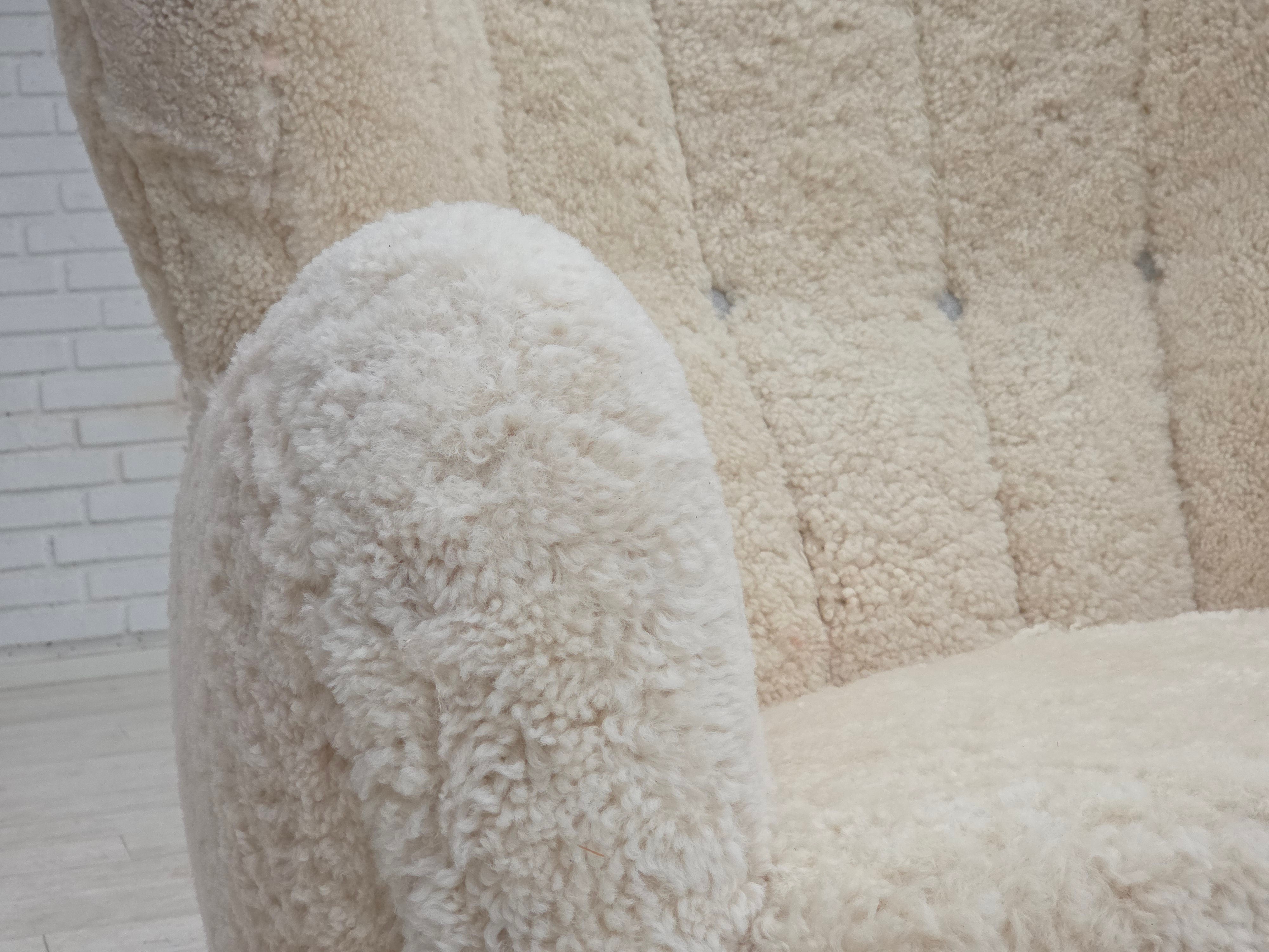 1960erne, Dansk højrygget lænestol, ægte fåreskind "Canberra", reupholsteret.