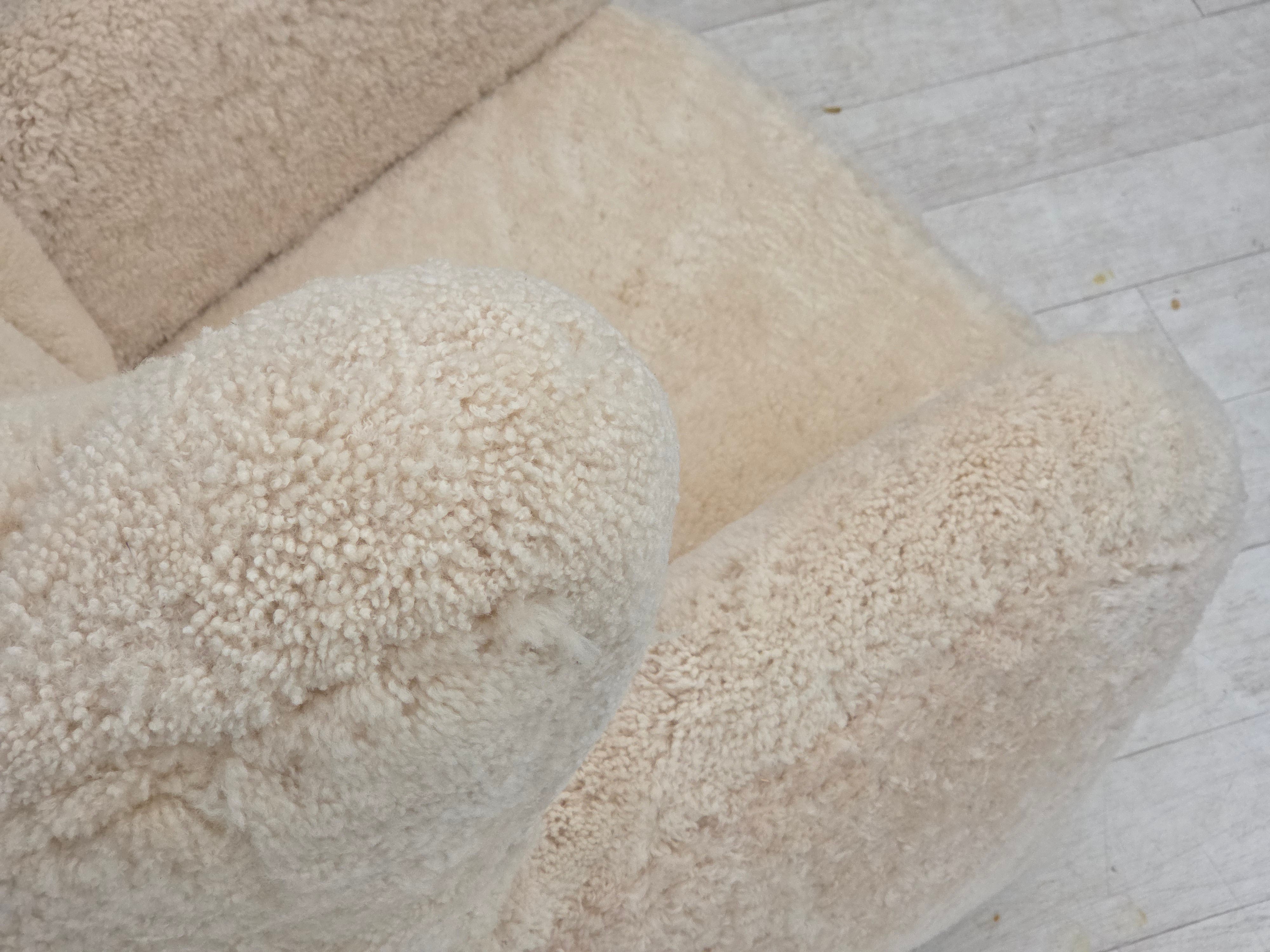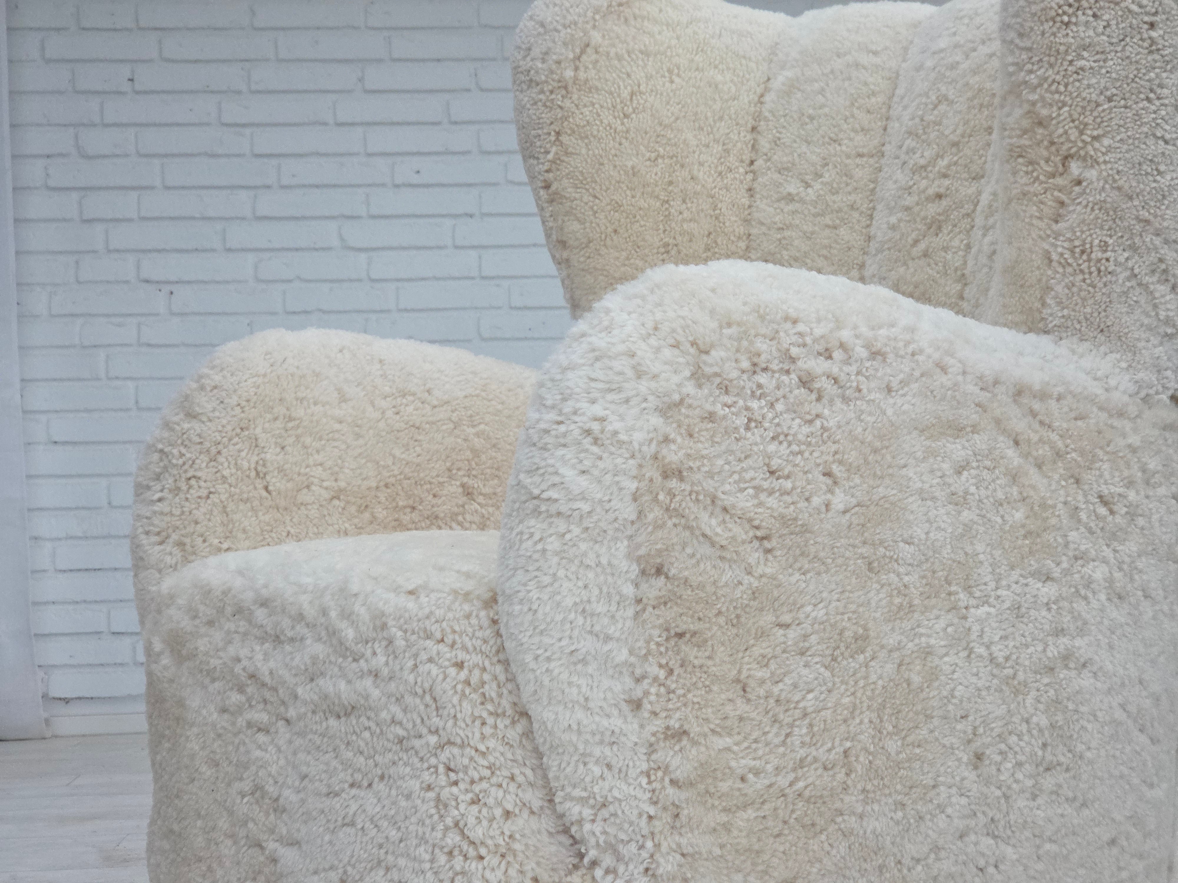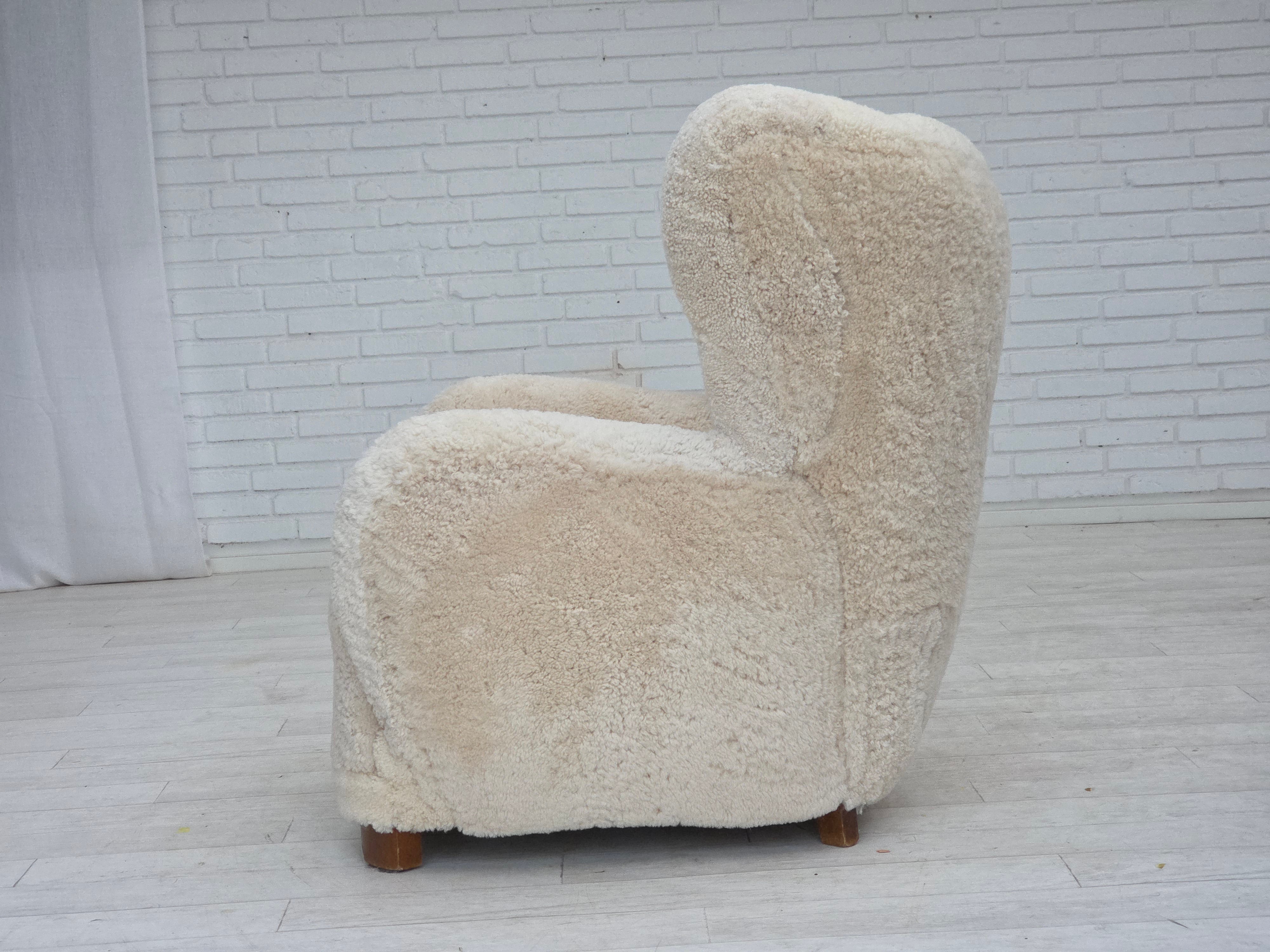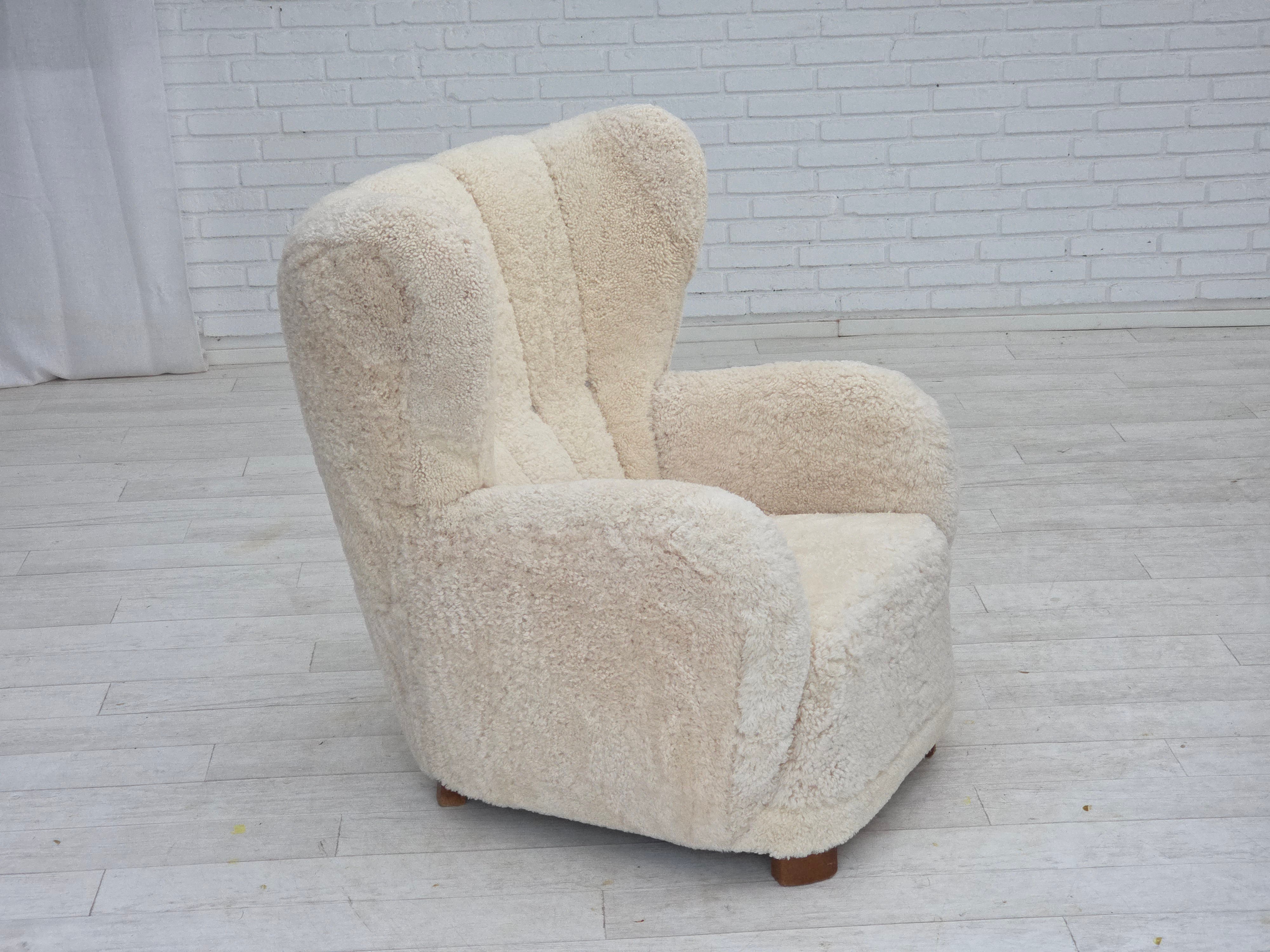 1960erne, Dansk højrygget lænestol, ægte fåreskind "Canberra", reupholsteret.